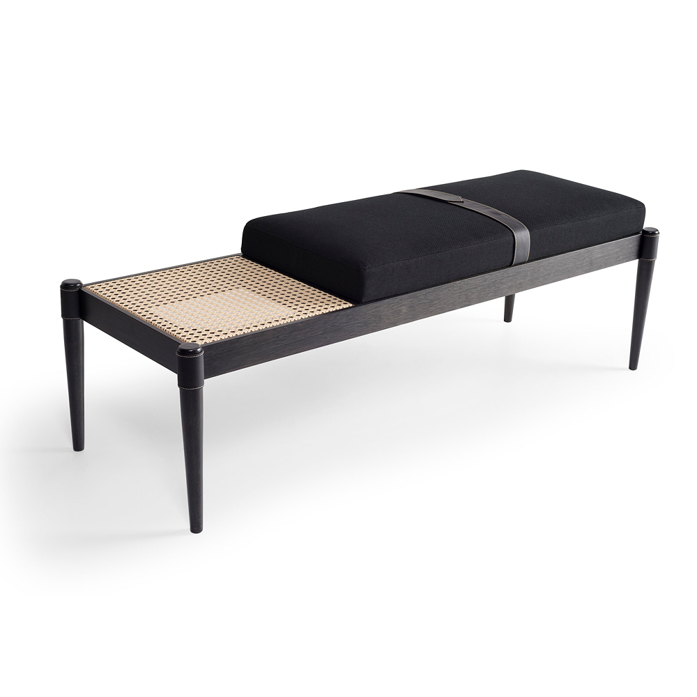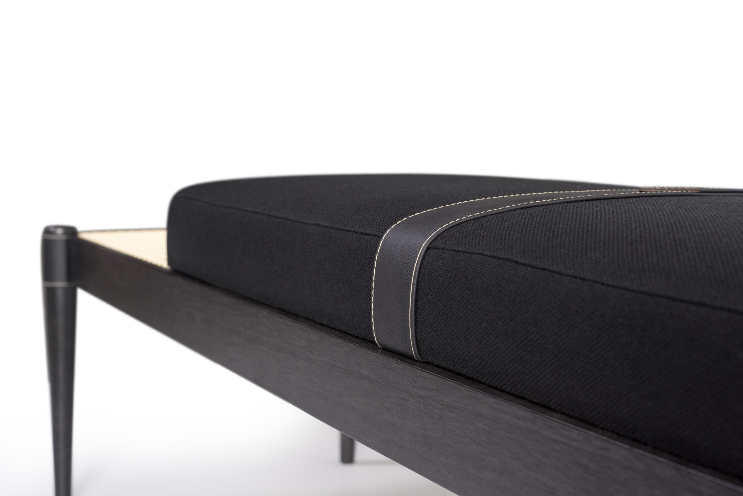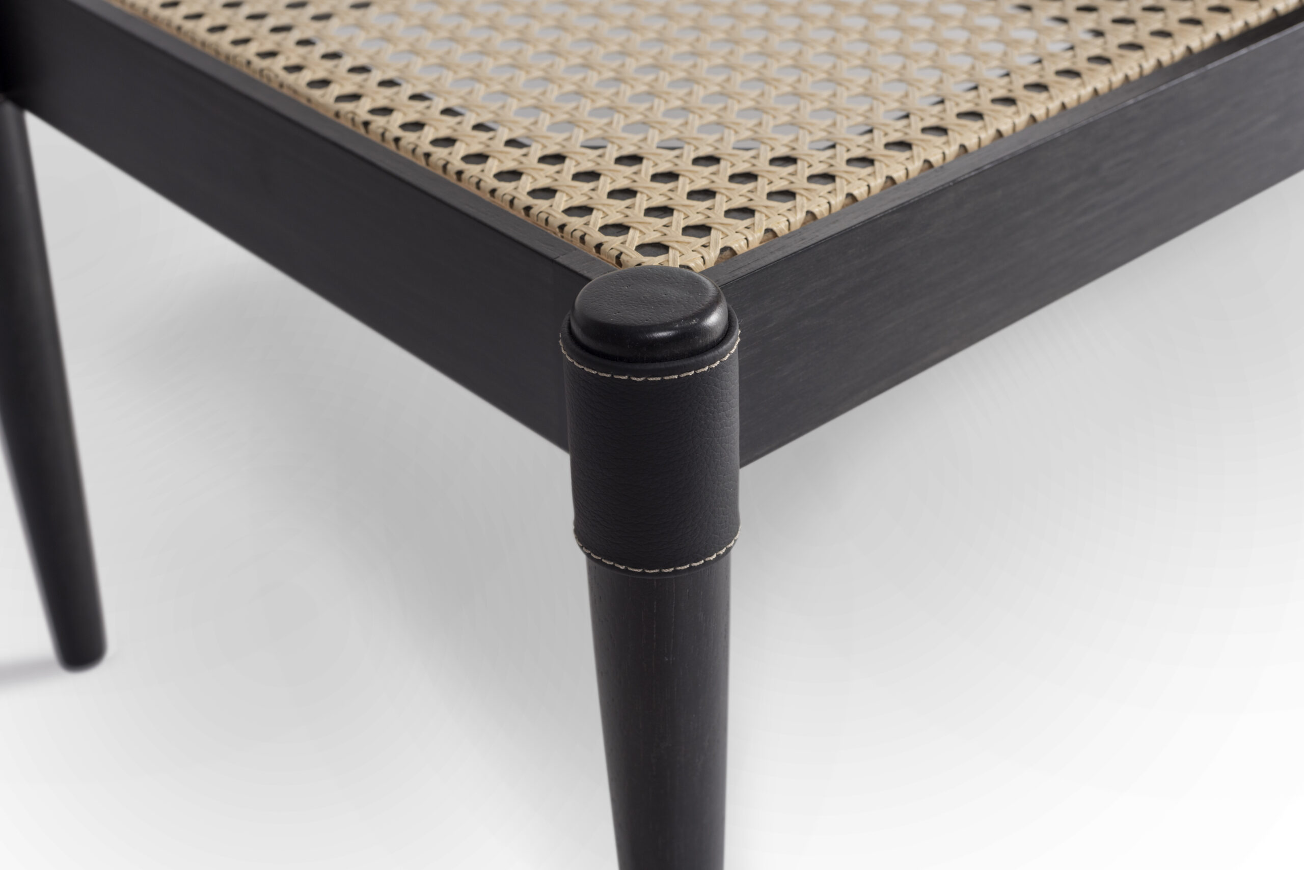Banco com design minimalista, estrutura em madeira maciça de Tauari tingido, assento estofado e detalhes em palha portuguesa e cintas de couro.