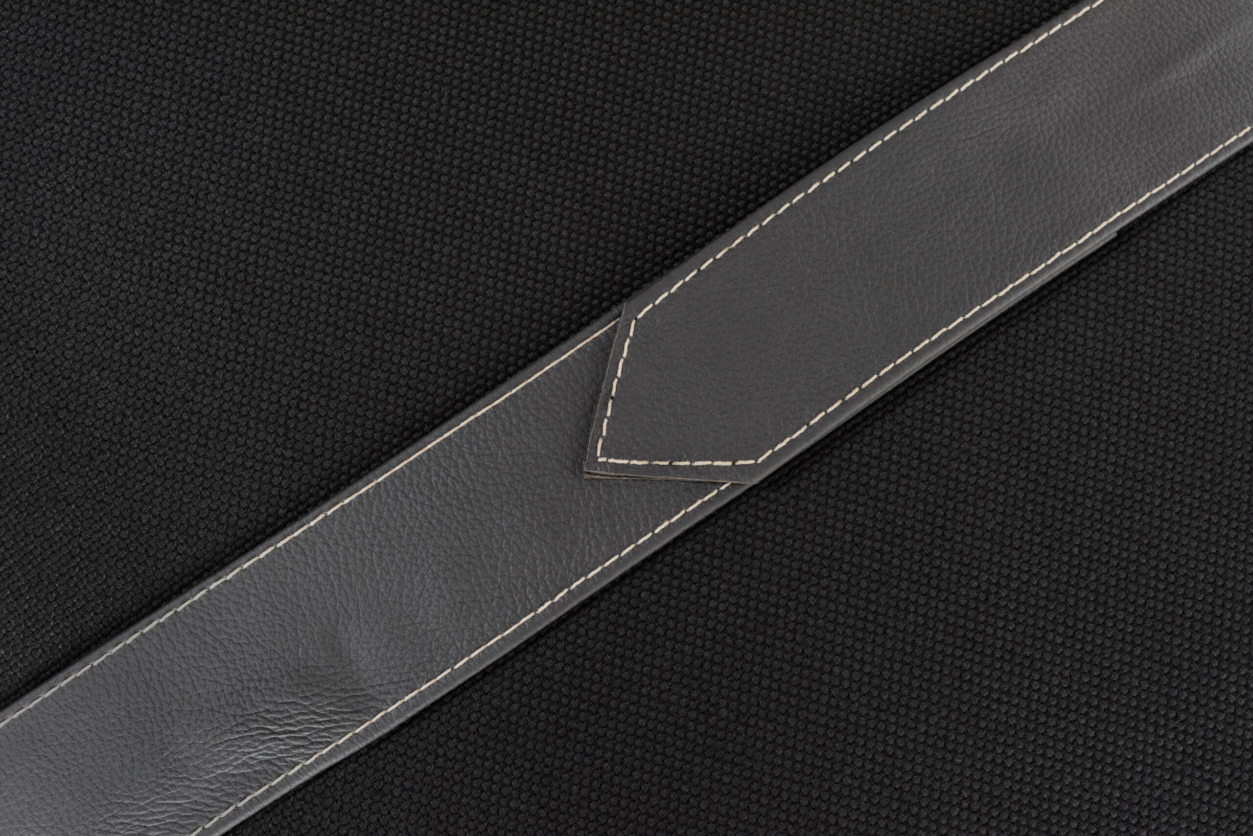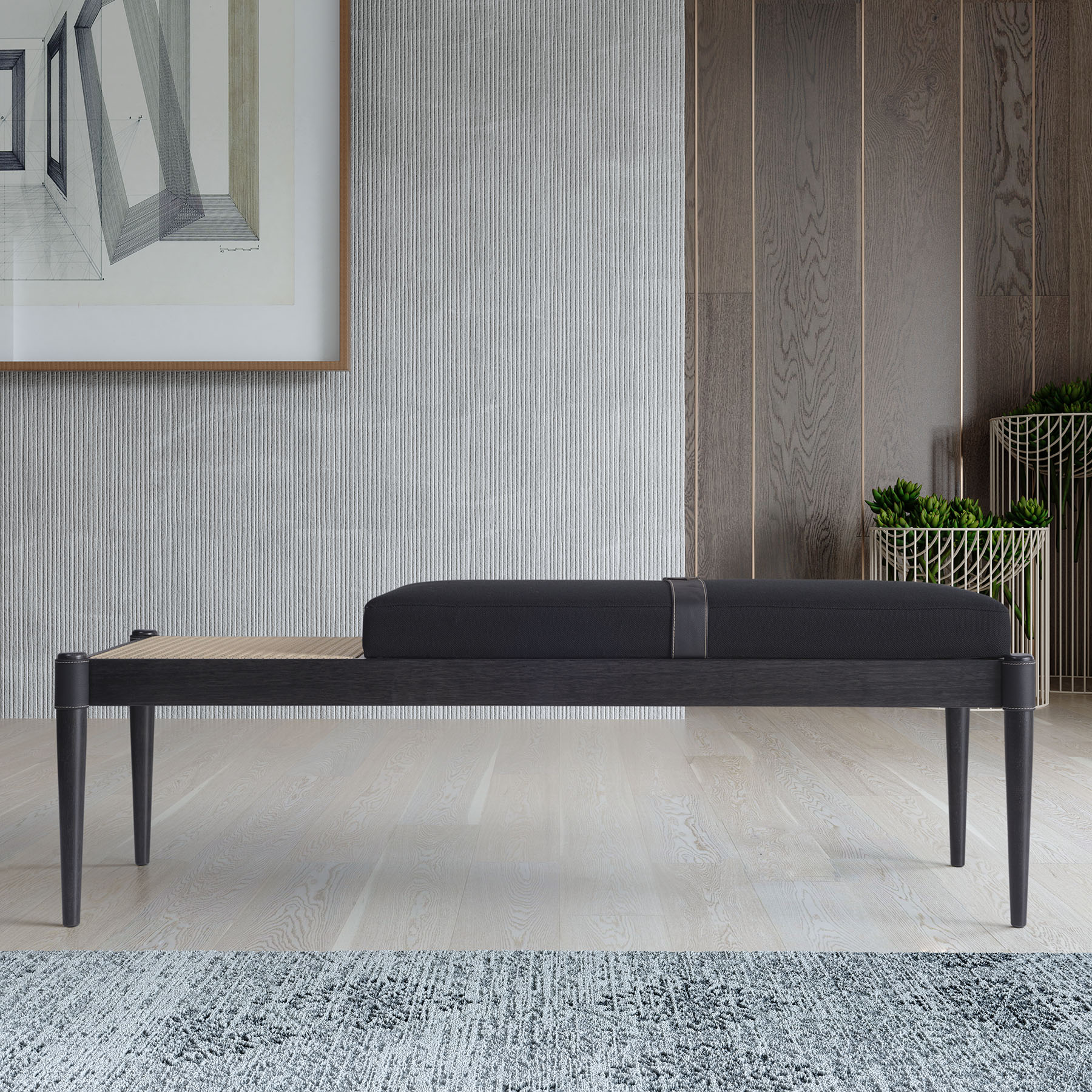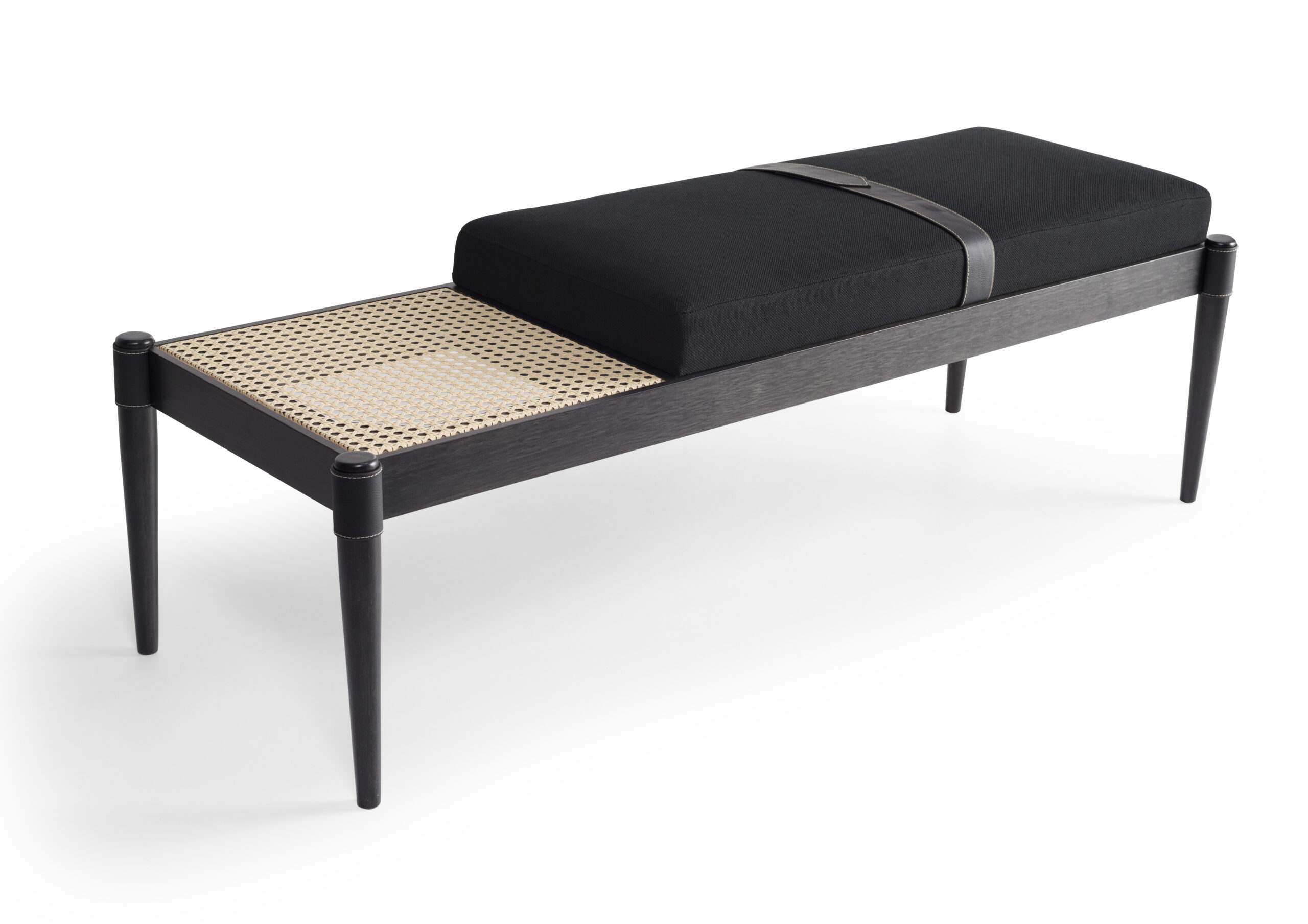 Banco com design minimalista, estrutura em madeira maciça de Tauari tingido, assento estofado e detalhes em palha portuguesa e cintas de couro.