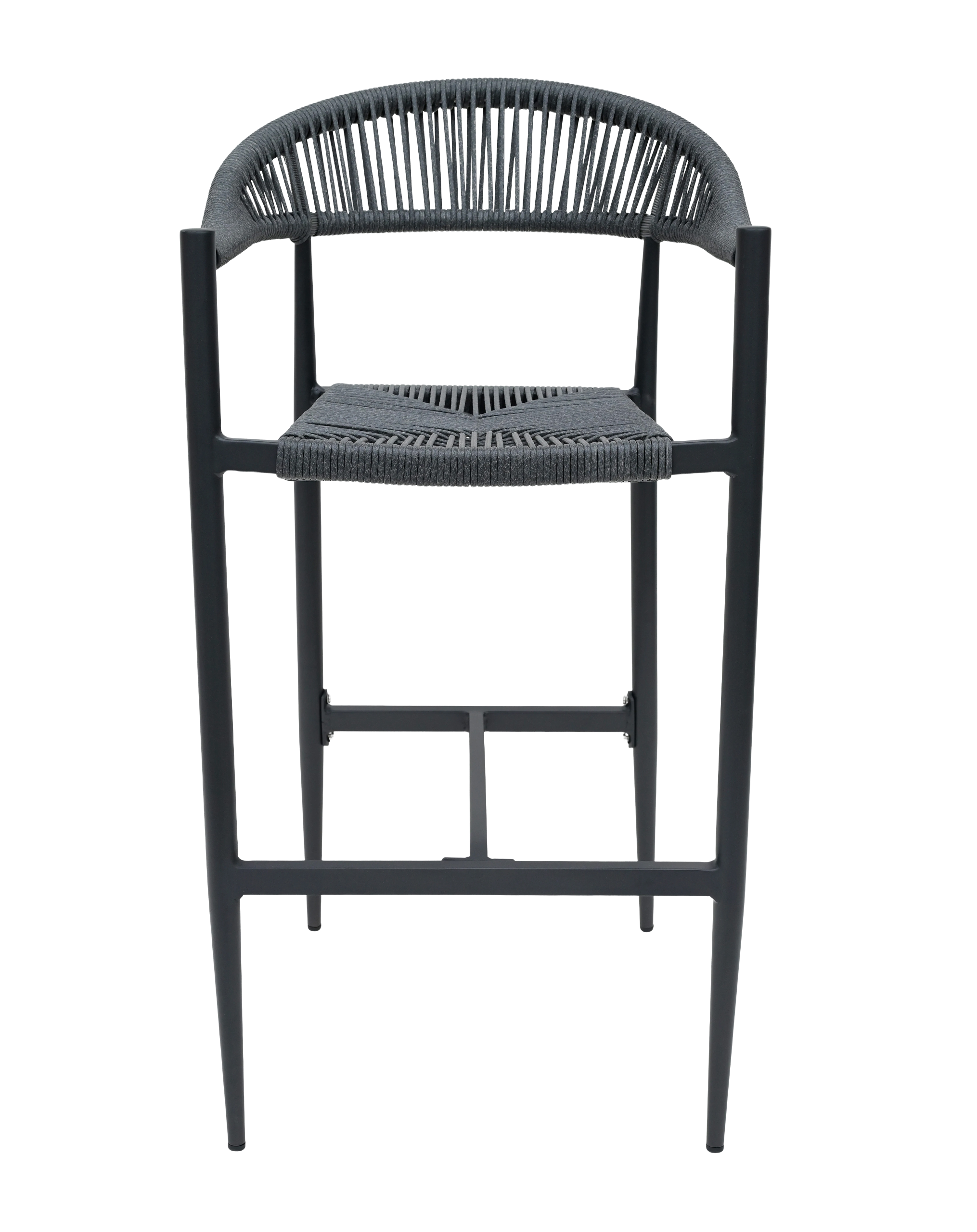 Banqueta moderna com estrutura em alumínio e corda náutica, ideal para bancadas e áreas gourmet sofisticadas.