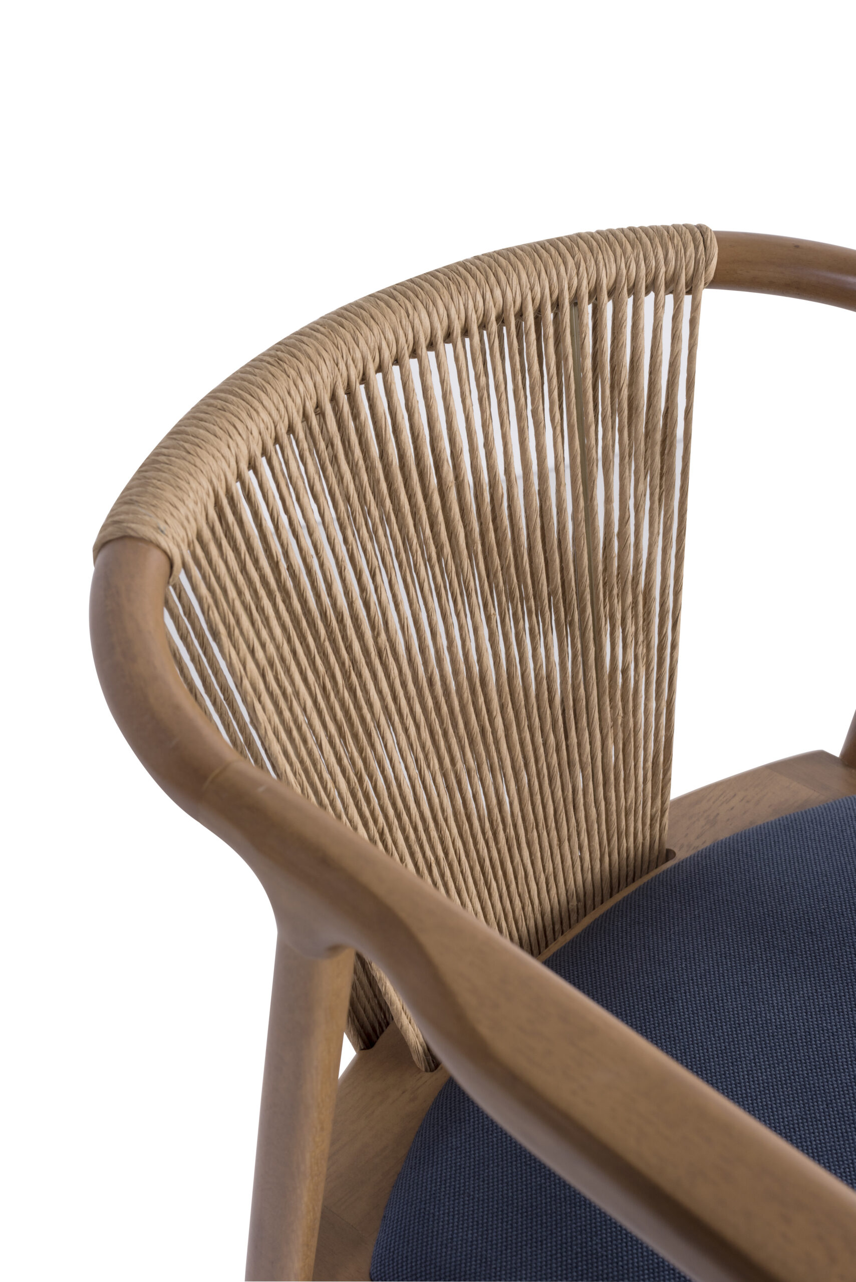 Cadeira com design moderno, estrutura em madeira maciça e encosto em corda trançada, proporcionando conforto e estilo ao ambiente.