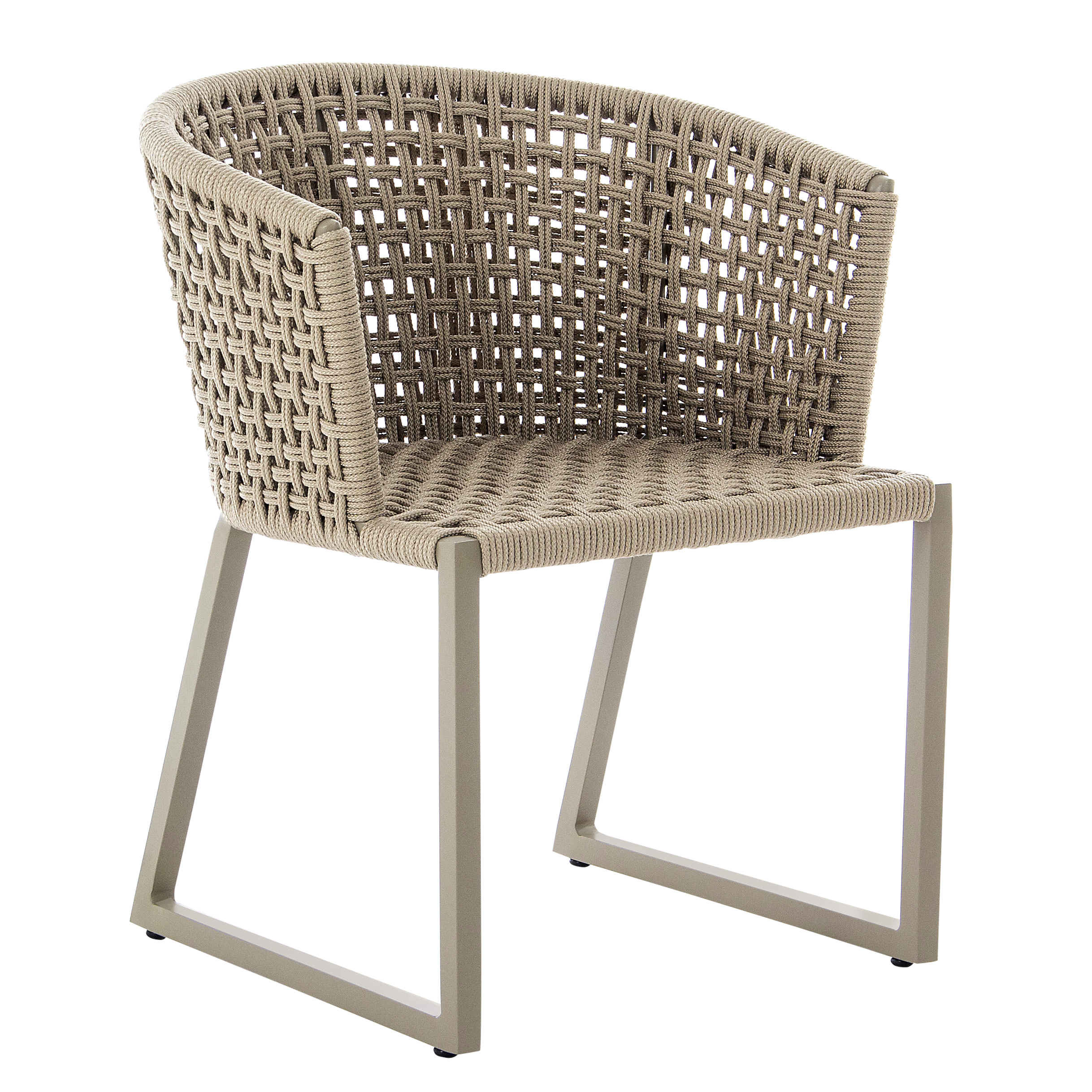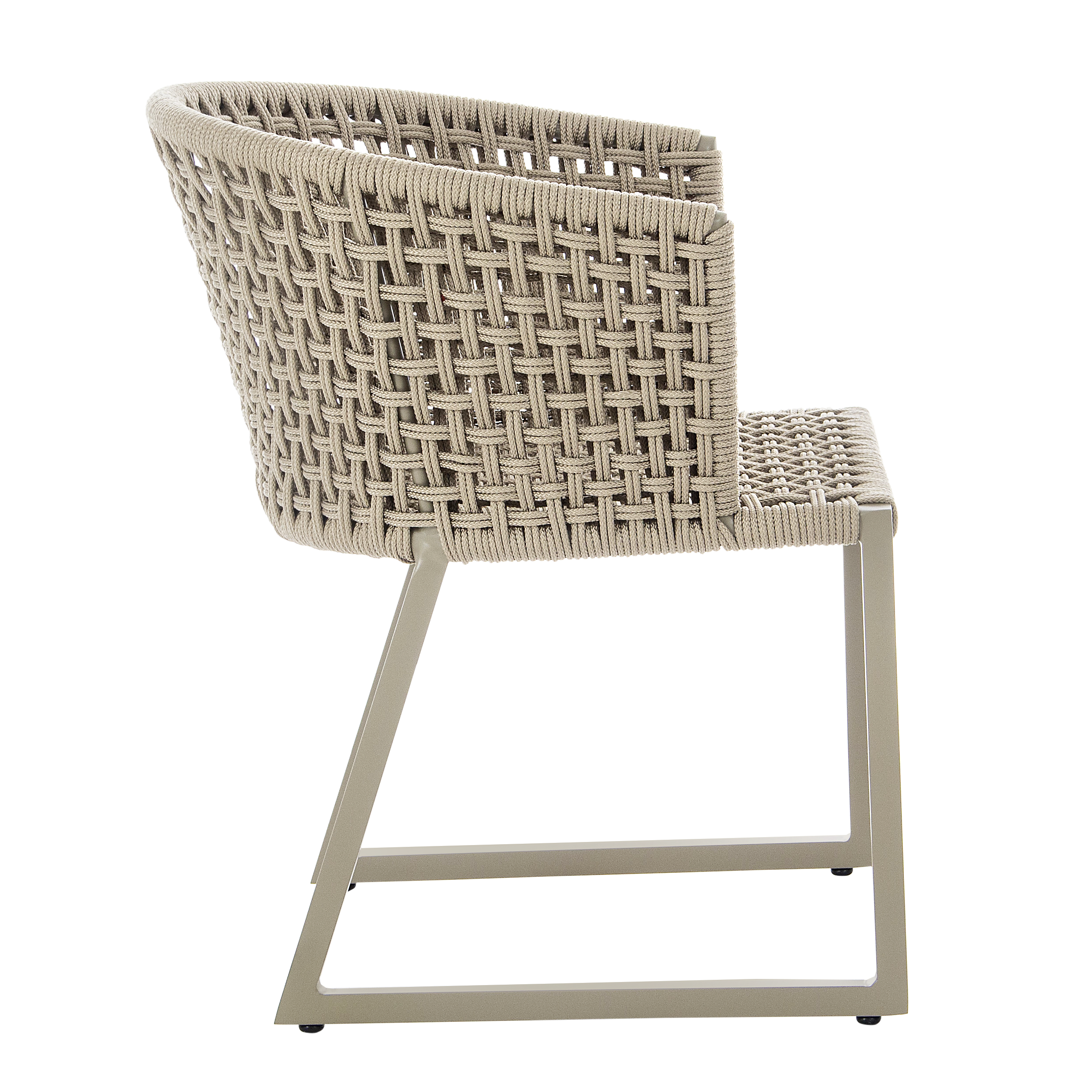 Cadeira com estrutura em alumínio e assento em corda náutica trançada, que combina leveza, durabilidade e um toque artesanal.