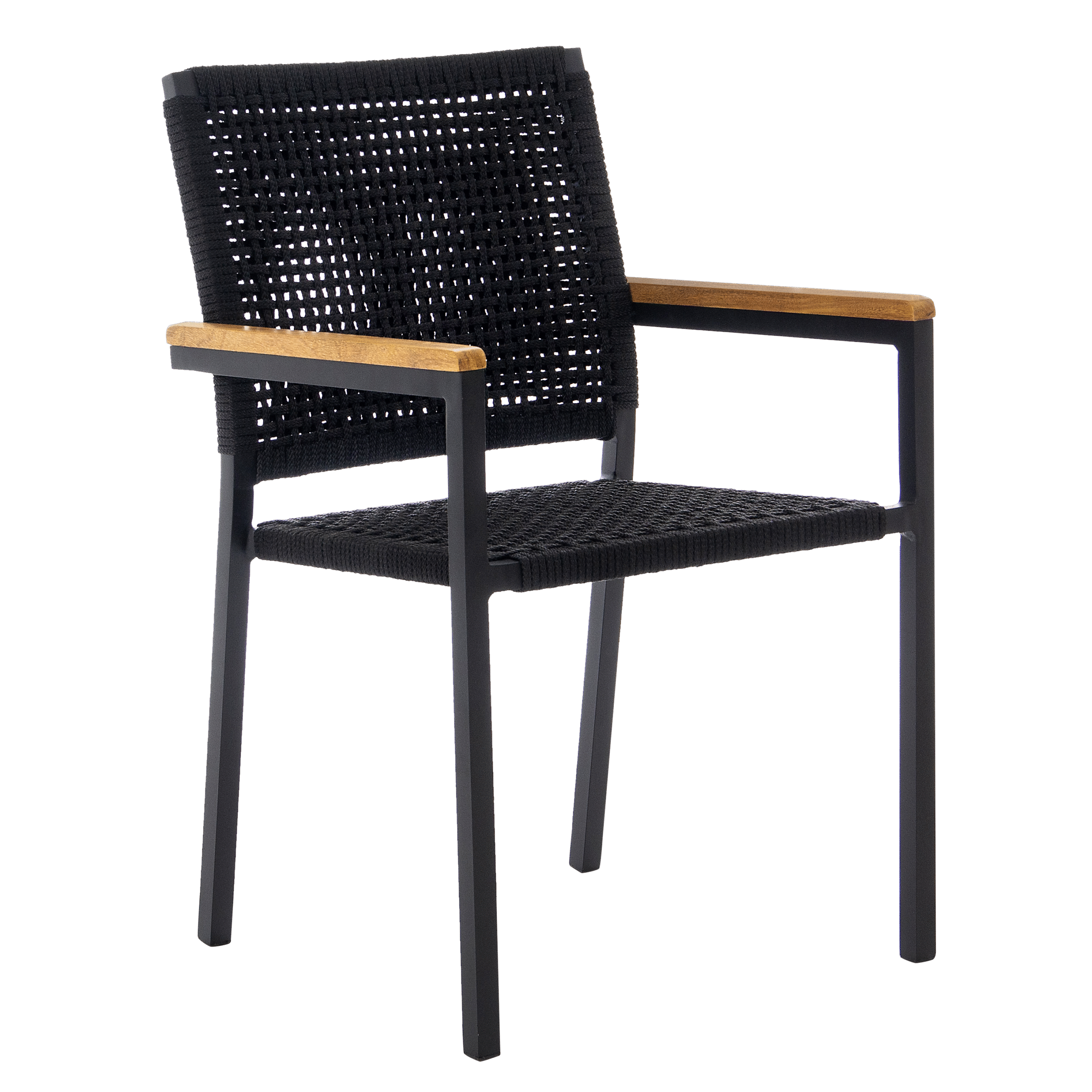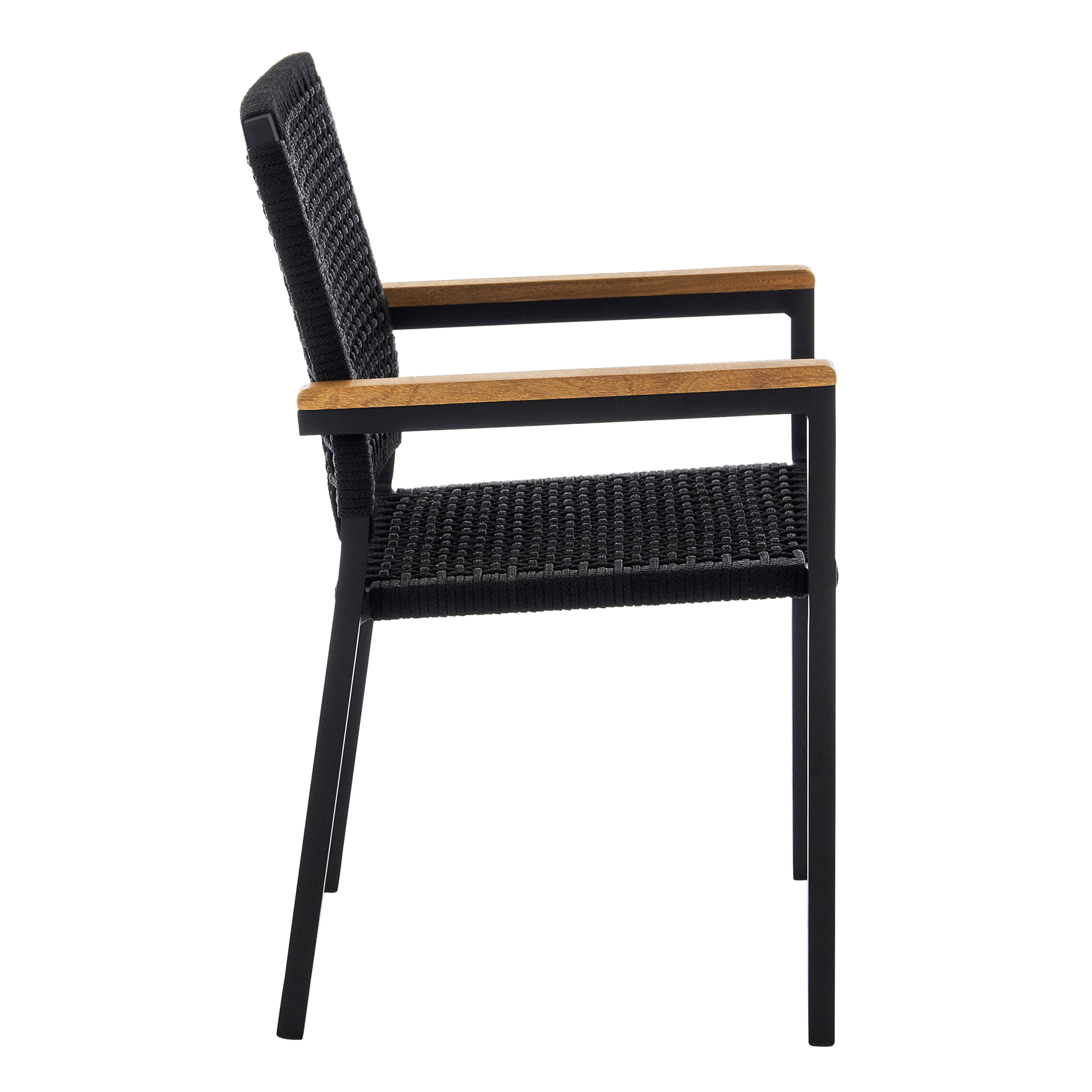 Os apoios de braço em madeira natural trazem um toque de calor e sofisticação, criando uma peça versátil para áreas externas ou internas, ideal para composições elegantes e acolhedoras.