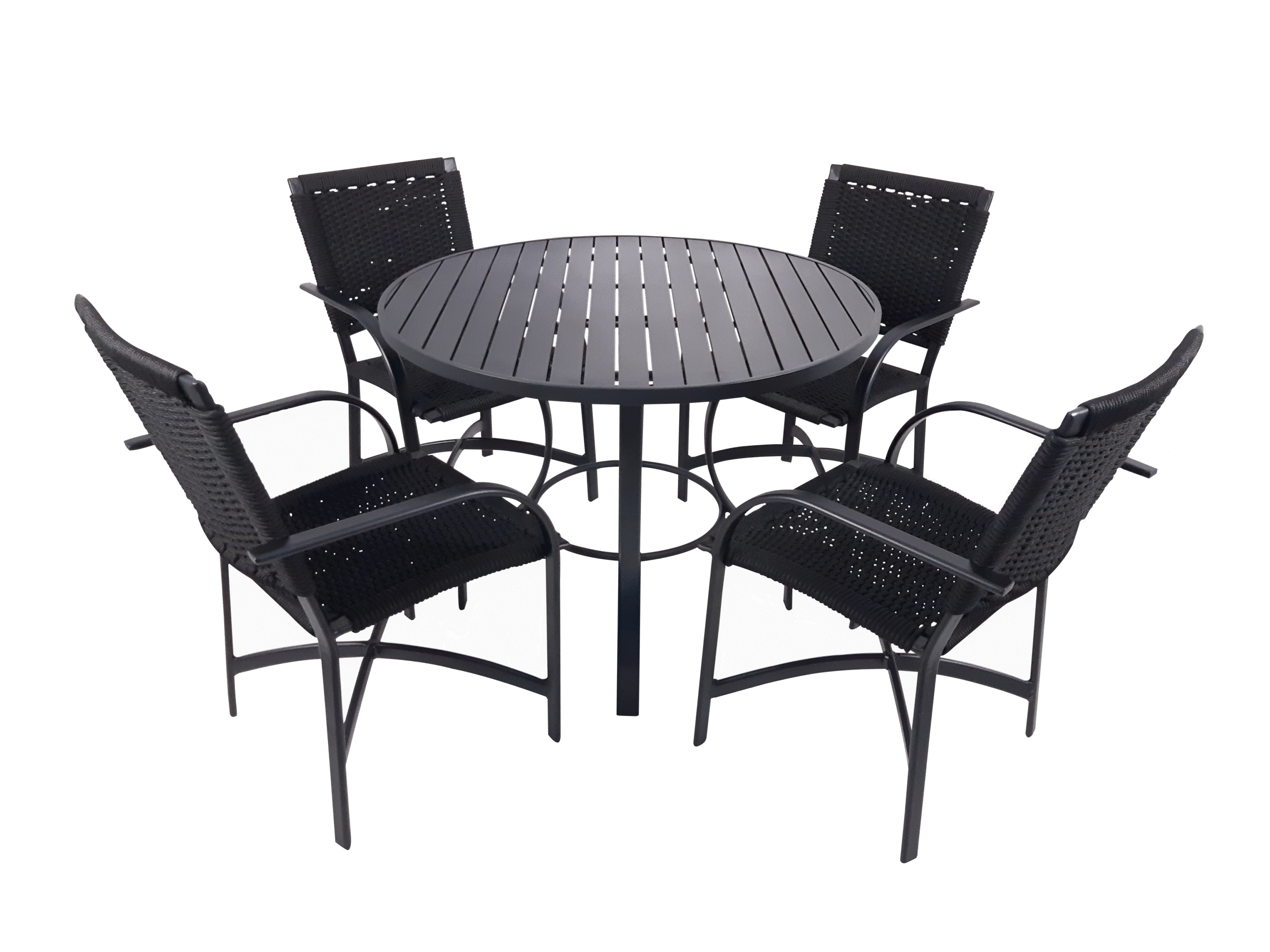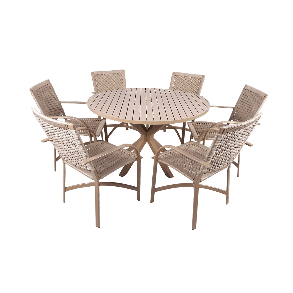 Mesa com estrutura em alumínio com pintura eletrostática e com diversas opções de tampo, como: tampo ripado em alumínio, tampo chapa lisa em alumínio, tampo chapa lisa com centro giratório no mesmo nível, tampo ripado em madeira e tampo em formado de pizza em madeira.